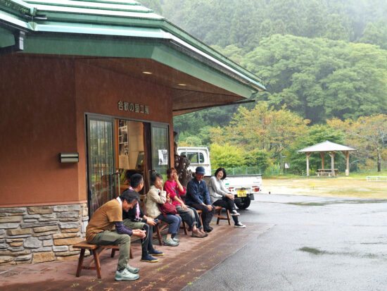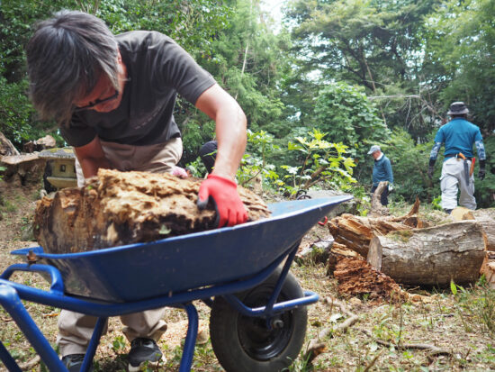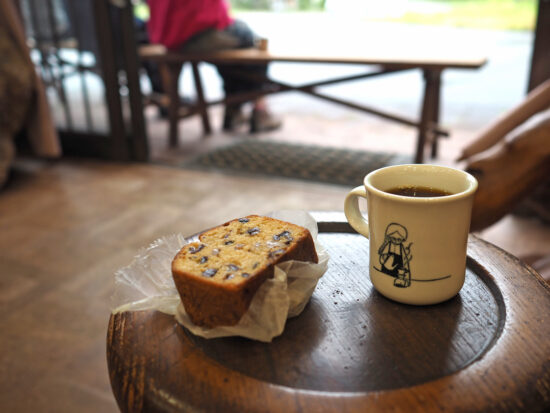 小雨の降る中、林道の草刈りなどを行い、コーヒーと焼菓子でひと息つきました。