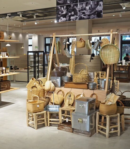 催事「銀座松野屋POP UP~手仕事と生きる荒物店~」の際は、屋台とその周りを荒物で埋め尽くし、立体感あふれる売り場となりました。